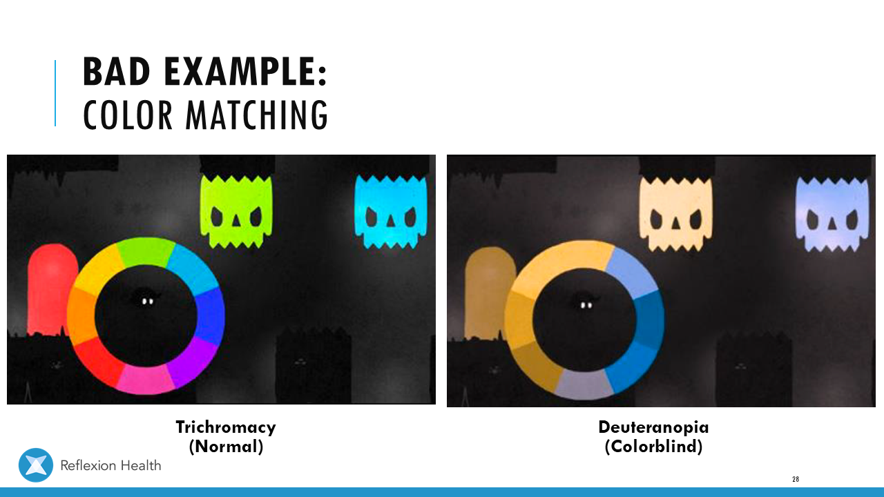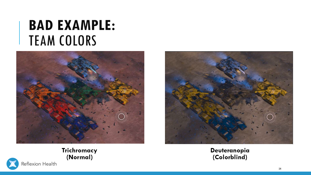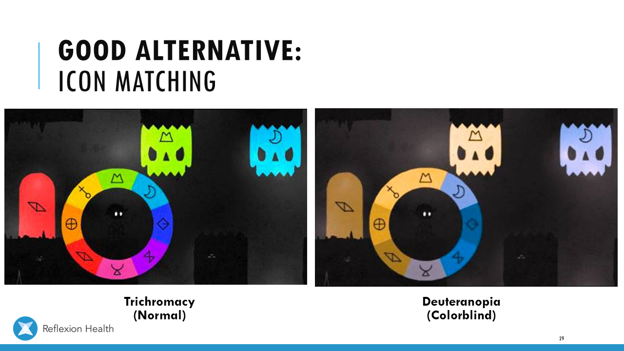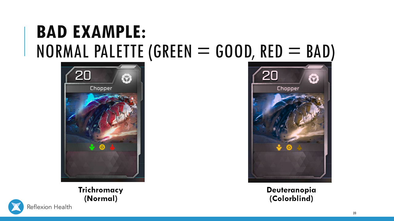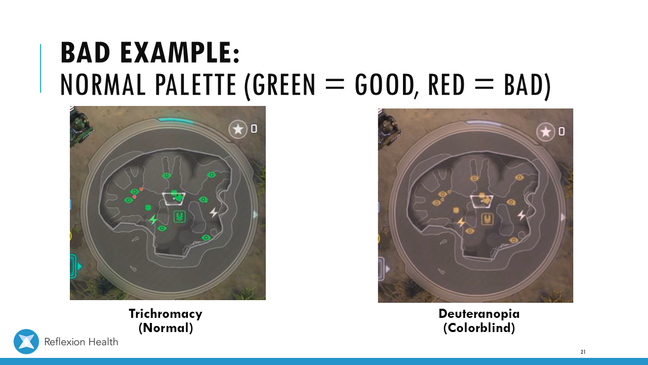 Accessible Game Design (Talk 2):Color Accessibility Download PDF Slide 1 Slide 1 (current slide) Slide 2 Slide 2 (current slide) Slide 3 Slide 3 (current slide) Slide 4 Slide 4 (current slide) Slide 5 Slide 5 (current slide) Slide 6 Slide 6 (current slide) Slide 7 Slide 7 (current slide) Slide 8 Slide 8 (current slide) Slide 9 Slide 9 (current slide) Slide 10 Slide 10 (current slide) Slide 11 Slide 11 (current slide) Slide 12 Slide 12 (current slide) Slide 13 Slide 13 (current slide) Slide 14 Slide 14 (current slide) Slide 15 Slide 15 (current slide) Slide 16 Slide 16 (current slide) Slide 17 Slide 17 (current slide) Slide 18 Slide 18 (current slide) Slide 19 Slide 19 (current slide) Slide 20 Slide 20 (current slide) Slide 21 Slide 21 (current slide) Slide 22 Slide 22 (current slide) Slide 23 Slide 23 (current slide) Slide 24 Slide 24 (current slide) Slide 25 Slide 25 (current slide) Slide 26 Slide 26 (current slide) Slide 27 Slide 27 (current slide) Slide 28 Slide 28 (current slide) Slide 29 Slide 29 (current slide) Slide 30 Slide 30 (current slide) Slide 31 Slide 31 (current slide) Slide 32 Slide 32 (current slide) Slide 33 Slide 33 (current slide) Slide 34 Slide 34 (current slide) Slide 35 Slide 35 (current slide) Slide 36 Slide 36 (current slide) Slide 37 Slide 37 (current slide) <- Previous Talk: Text Accessibility Next Talk: Audio Accessibility ->