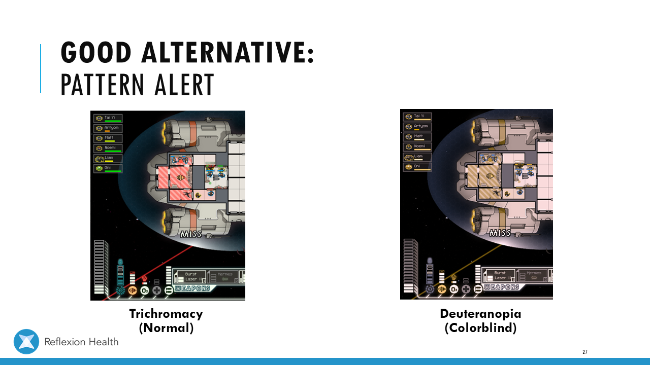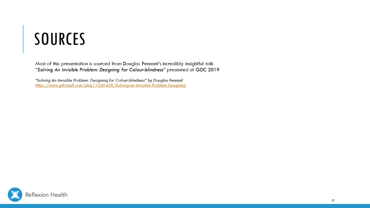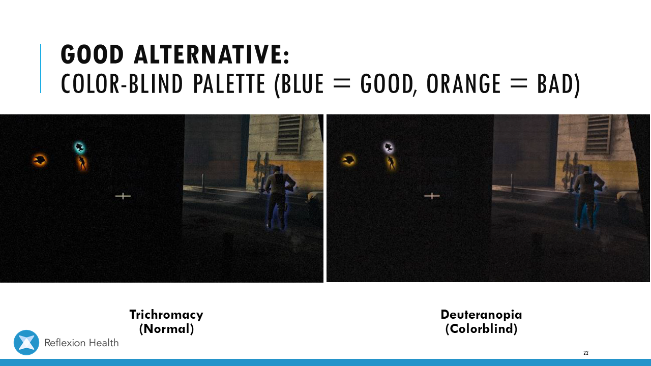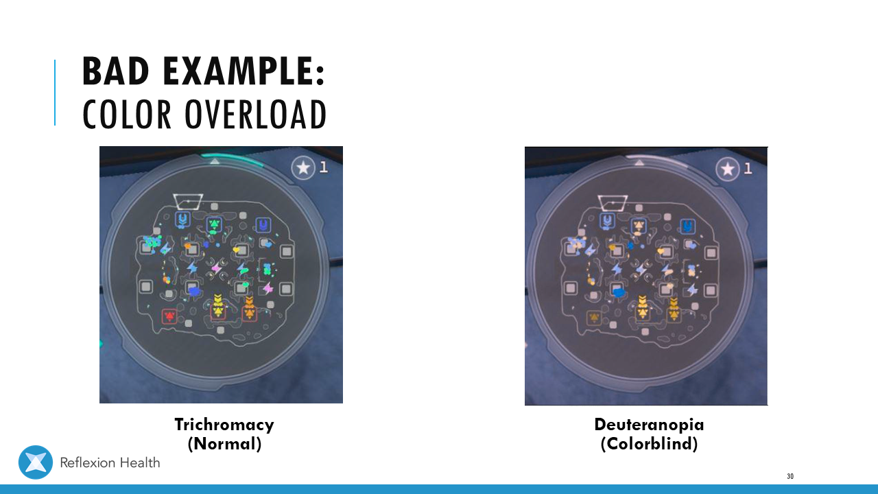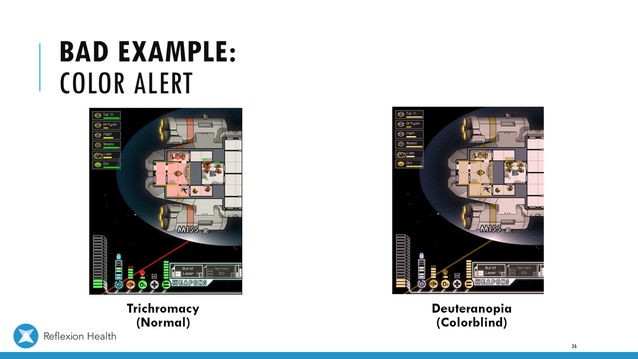 Accessible Game Design (Talk 2):Color Accessibility Download PDF Slide 1 Slide 1 (current slide) Slide 2 Slide 2 (current slide) Slide 3 Slide 3 (current slide) Slide 4 Slide 4 (current slide) Slide 5 Slide 5 (current slide) Slide 6 Slide 6 (current slide) Slide 7 Slide 7 (current slide) Slide 8 Slide 8 (current slide) Slide 9 Slide 9 (current slide) Slide 10 Slide 10 (current slide) Slide 11 Slide 11 (current slide) Slide 12 Slide 12 (current slide) Slide 13 Slide 13 (current slide) Slide 14 Slide 14 (current slide) Slide 15 Slide 15 (current slide) Slide 16 Slide 16 (current slide) Slide 17 Slide 17 (current slide) Slide 18 Slide 18 (current slide) Slide 19 Slide 19 (current slide) Slide 20 Slide 20 (current slide) Slide 21 Slide 21 (current slide) Slide 22 Slide 22 (current slide) Slide 23 Slide 23 (current slide) Slide 24 Slide 24 (current slide) Slide 25 Slide 25 (current slide) Slide 26 Slide 26 (current slide) Slide 27 Slide 27 (current slide) Slide 28 Slide 28 (current slide) Slide 29 Slide 29 (current slide) Slide 30 Slide 30 (current slide) Slide 31 Slide 31 (current slide) Slide 32 Slide 32 (current slide) Slide 33 Slide 33 (current slide) Slide 34 Slide 34 (current slide) Slide 35 Slide 35 (current slide) Slide 36 Slide 36 (current slide) Slide 37 Slide 37 (current slide) <- Previous Talk: Text Accessibility Next Talk: Audio Accessibility ->